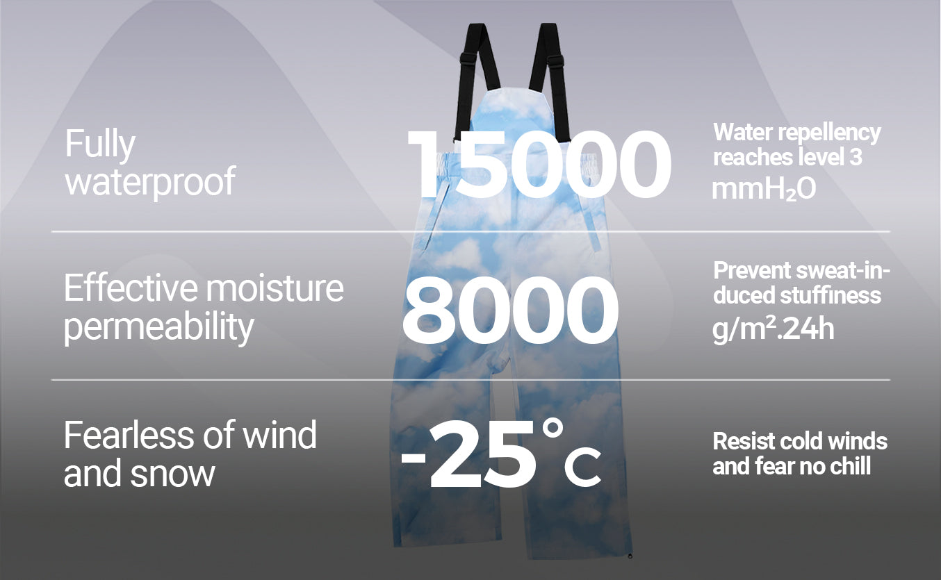 The outer fabric is treated with a water-repellent DWR finish to prevent wetness from soaking in, ensuring dryness even when seated on snow. The mid-layer incorporates a moisture-wicking membrane designed to expel internal vapor through micro-pores, actively managing humidity for lasting comfort