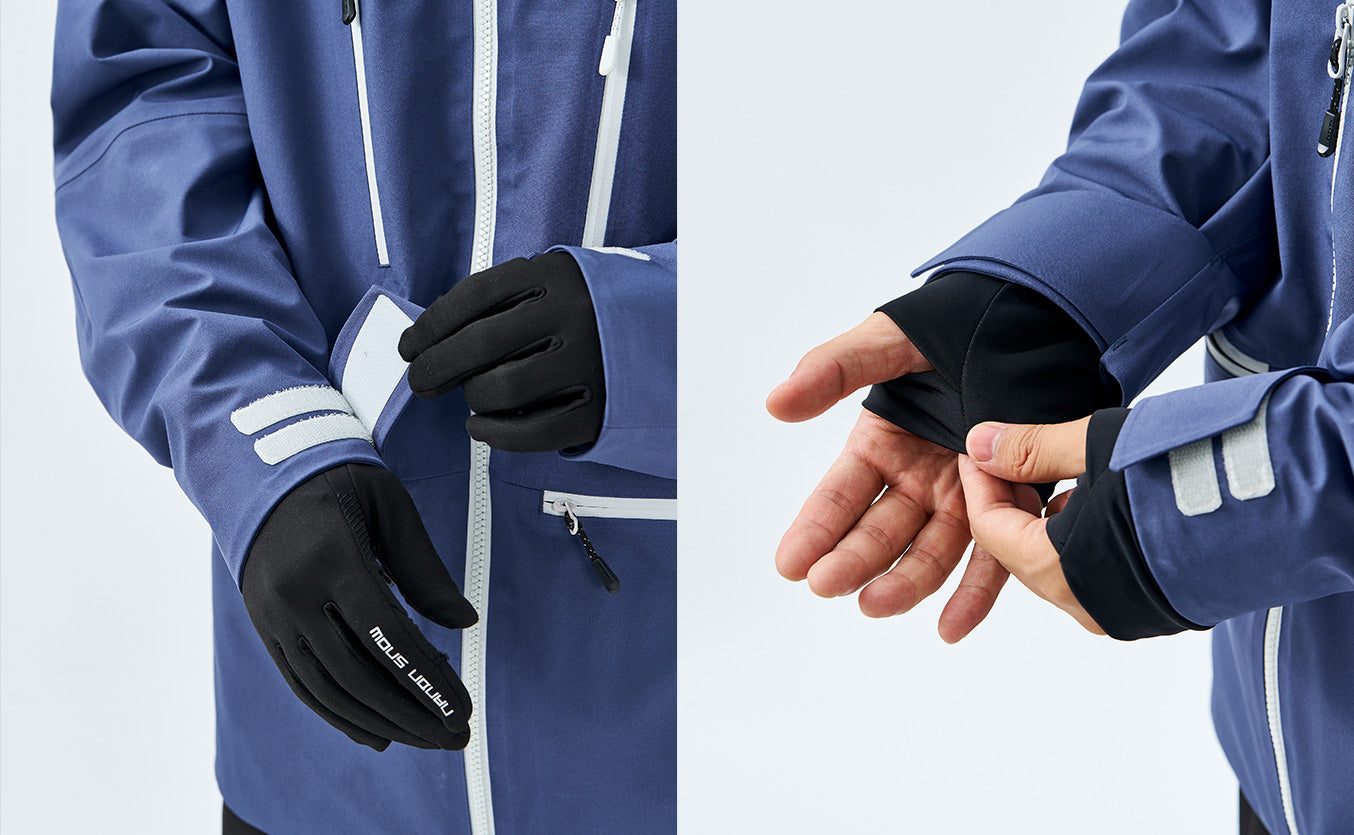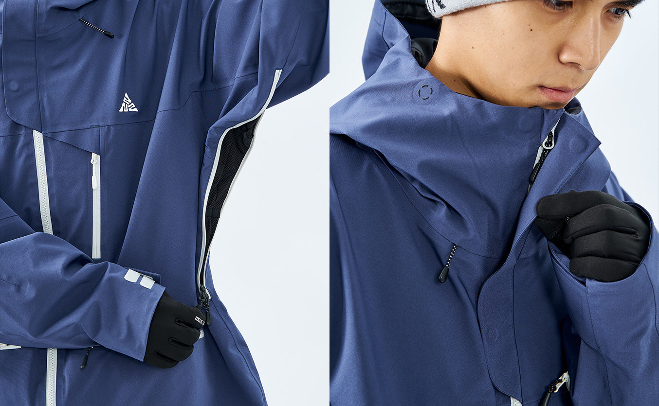 Surface is treated with a durable water-repellent (DWR) coating, enabling it to shed snow and moisture and stay dry even when sitting on snow. Beneath it, a highly breathable membrane in the mid-layer allows perspiration vapor to escape through its micro-pores, preventing internal moisture buildup.