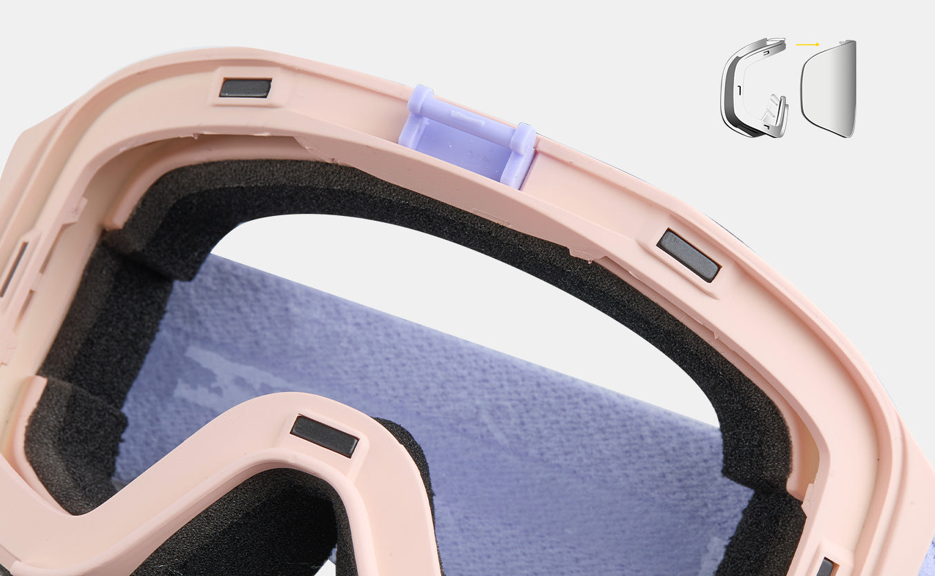 The latches allow for smooth and stable opening and closing of the lens flaps. Strong magnets securely attach the lenses to the ski goggle frame, ensuring safety.