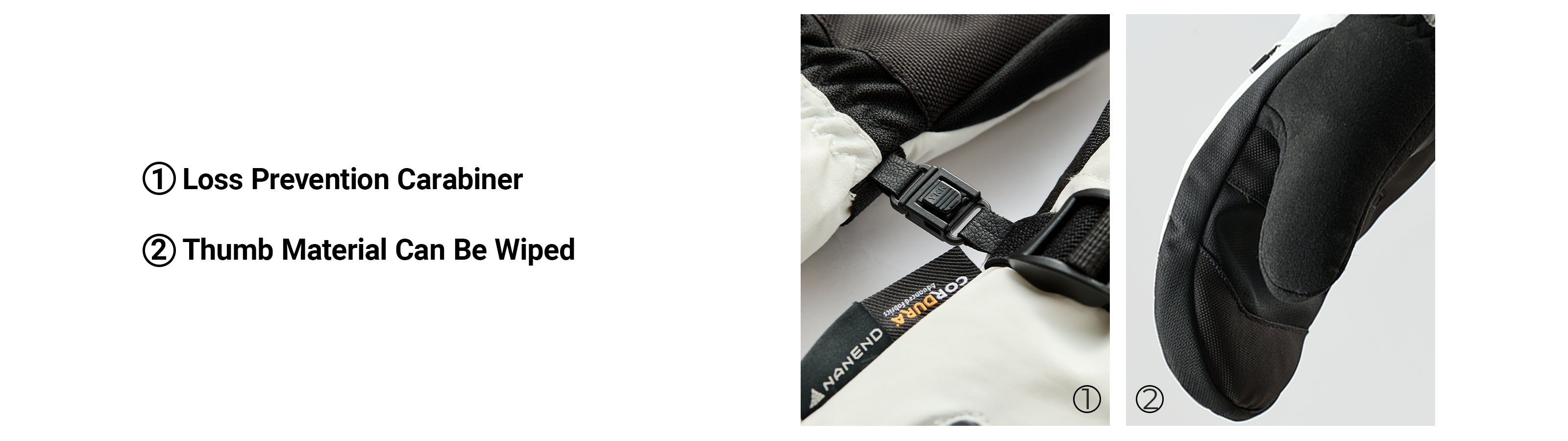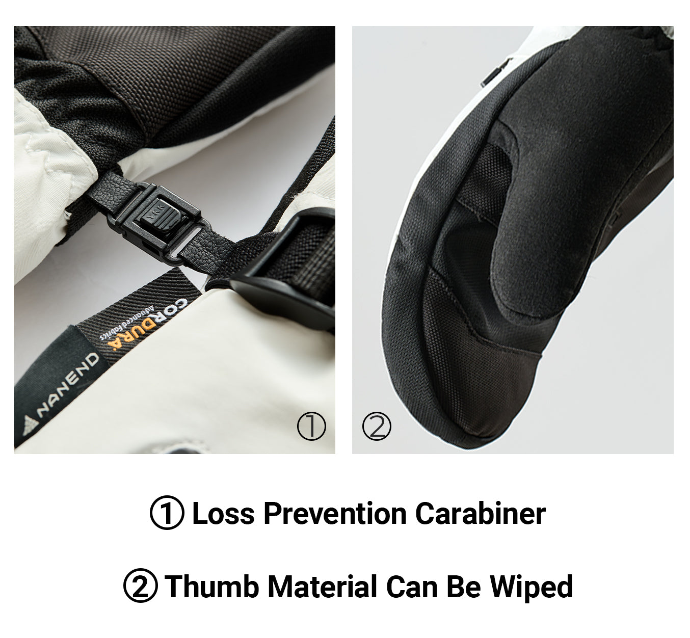 Details: The gloves are equipped with anti-loss carabiners, wipeable thumb material with snow card pockets and wrist anti-loss cords to bring you a better skiing experience.