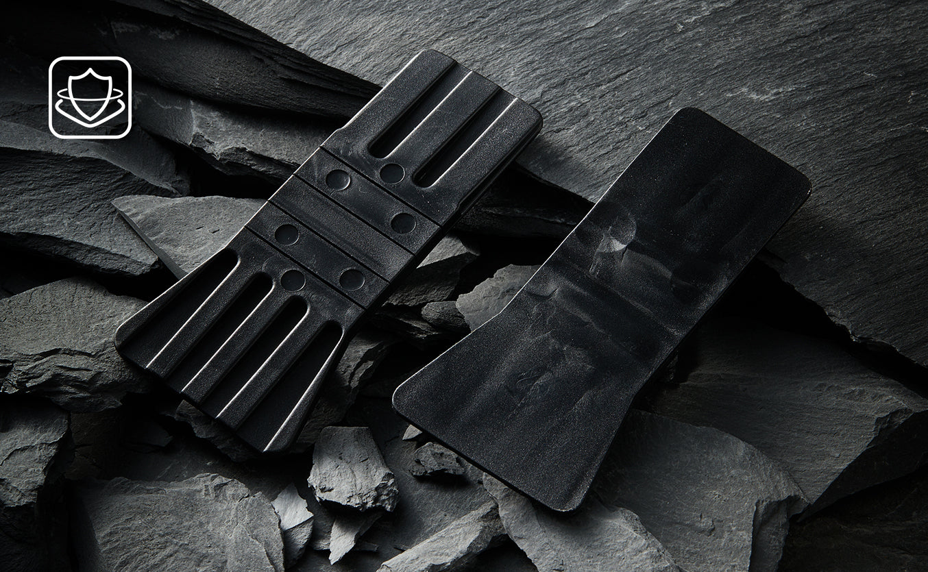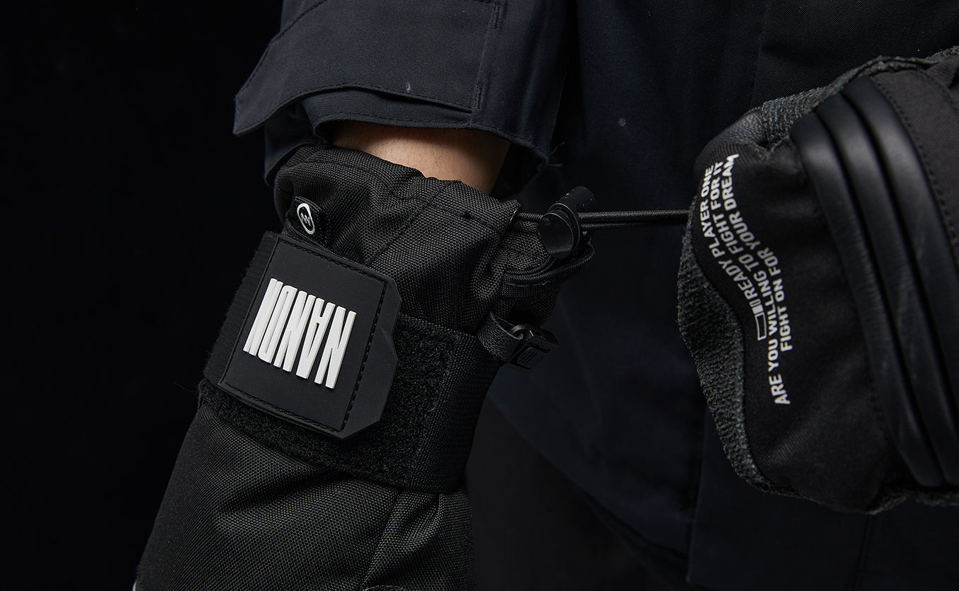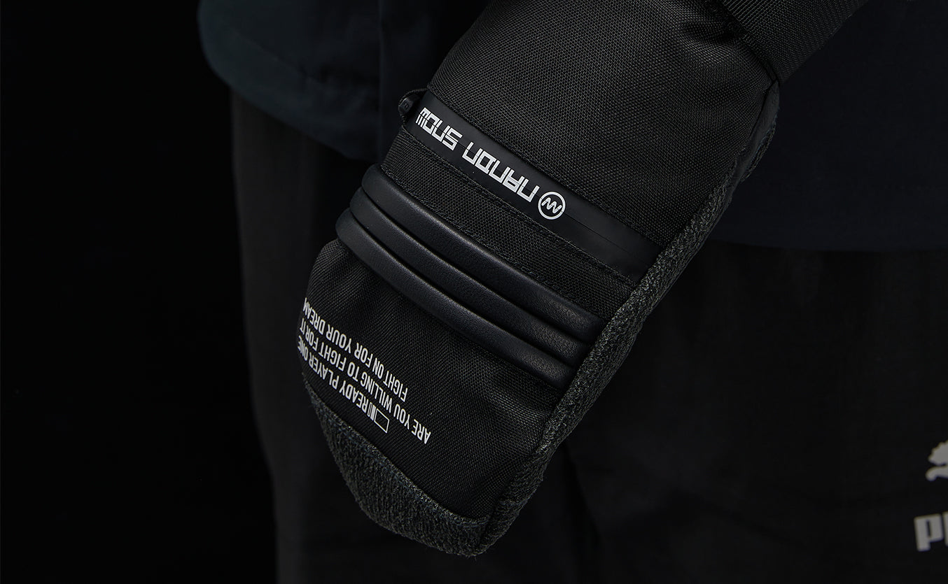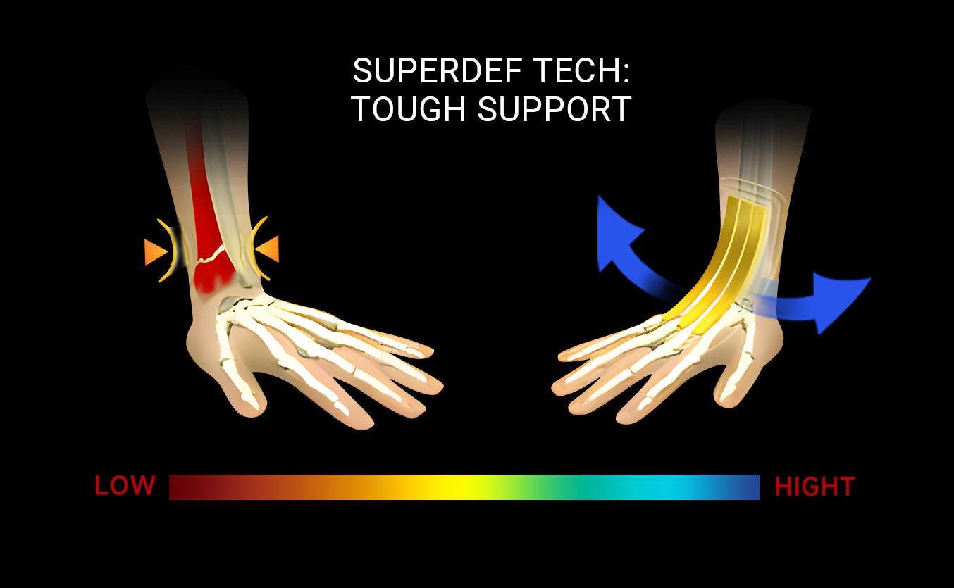 Dorsal (hand back) guard is made from a PE composite material that is comfortably flexible yet resilient. In the event of a fall, it helps prevent the hand from hyperextending backwards or dislocating upon impact with the ground.