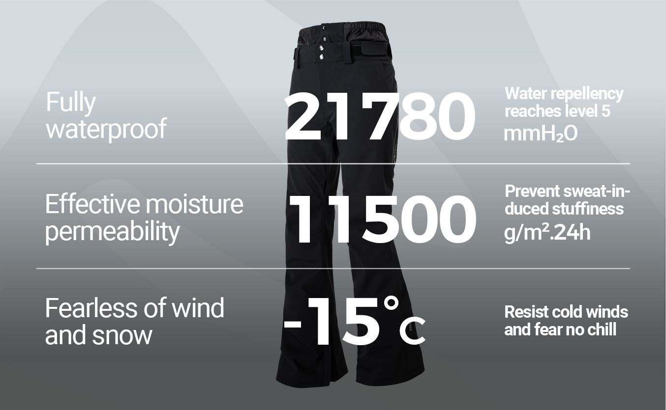 The outer layer is treated with a DWR (Durable Water Repellent) finish to shed surface moisture, keeping you dry even when sitting on snow. The mid-layer incorporates a moisture-permeable membrane, which allows internal vapor to escape through its micro-pores