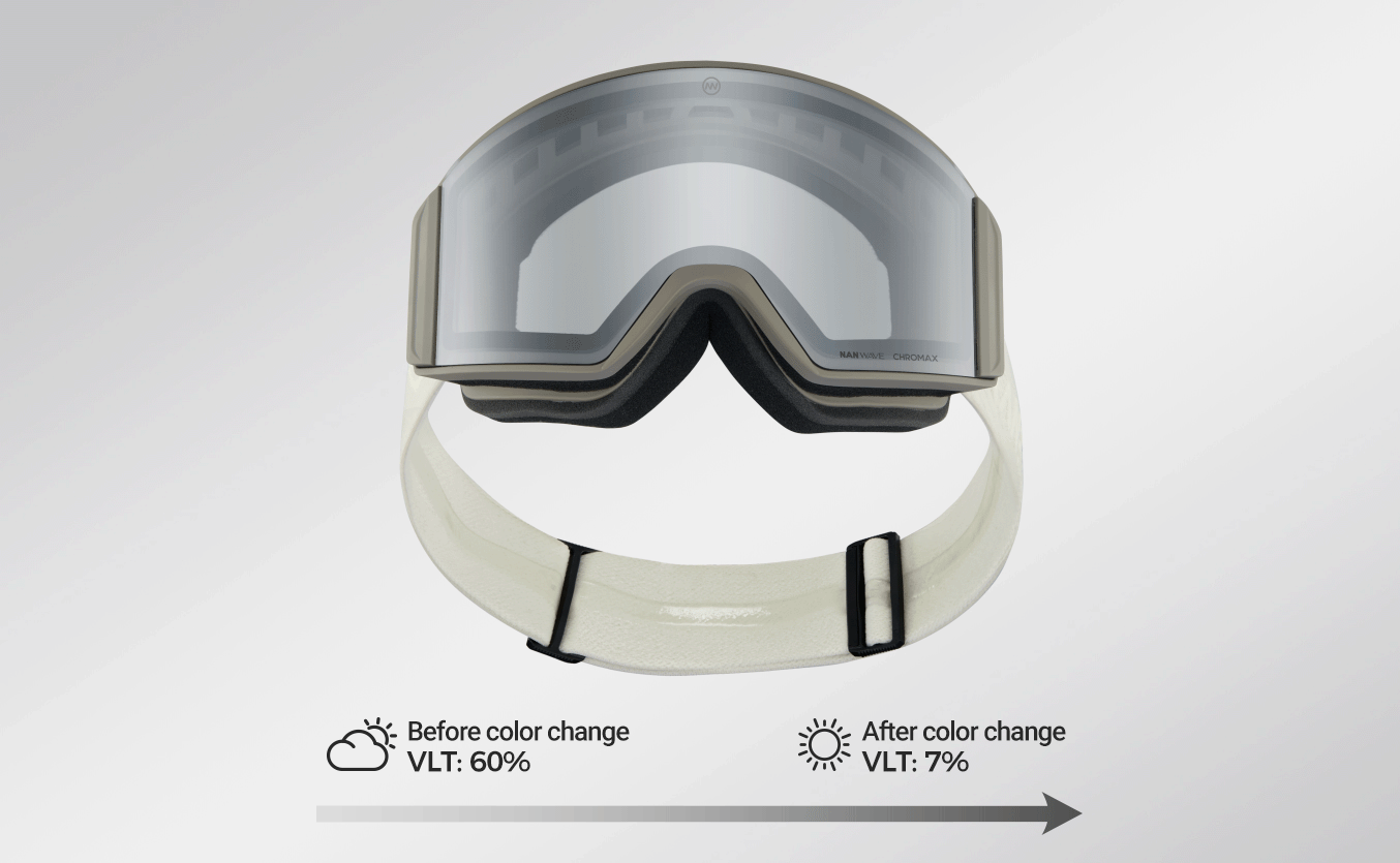 Photochromic Lens Technology: The lenses automatically adjust their tint in response to changing light conditions, regulating the Visible Light Transmission (VLT). This ensures optimal visual brightness and comfort, seamlessly adapting to bright sun, overcast skies, flat light, or snowy fog.