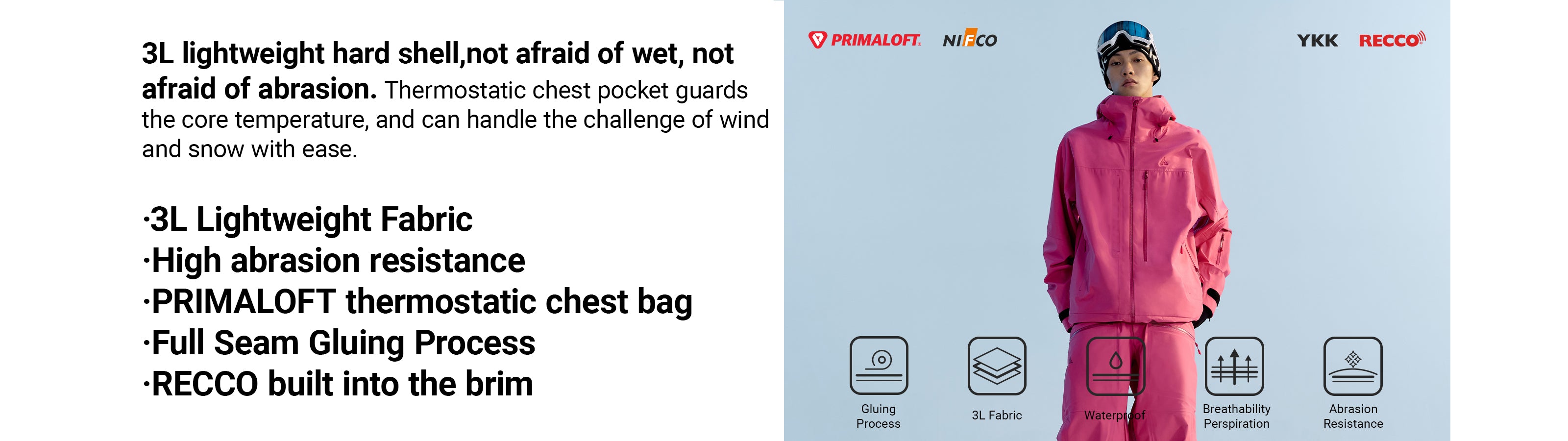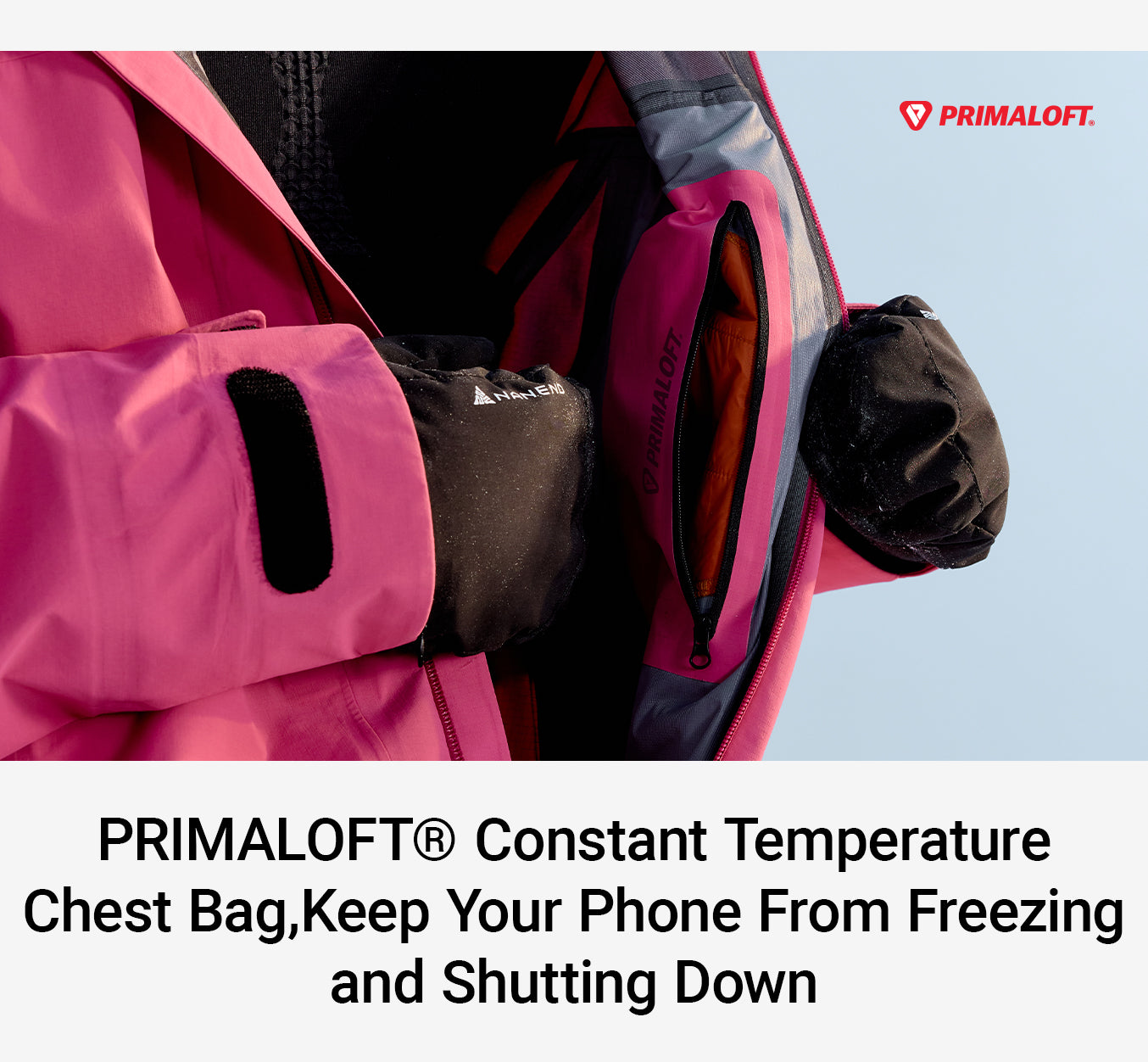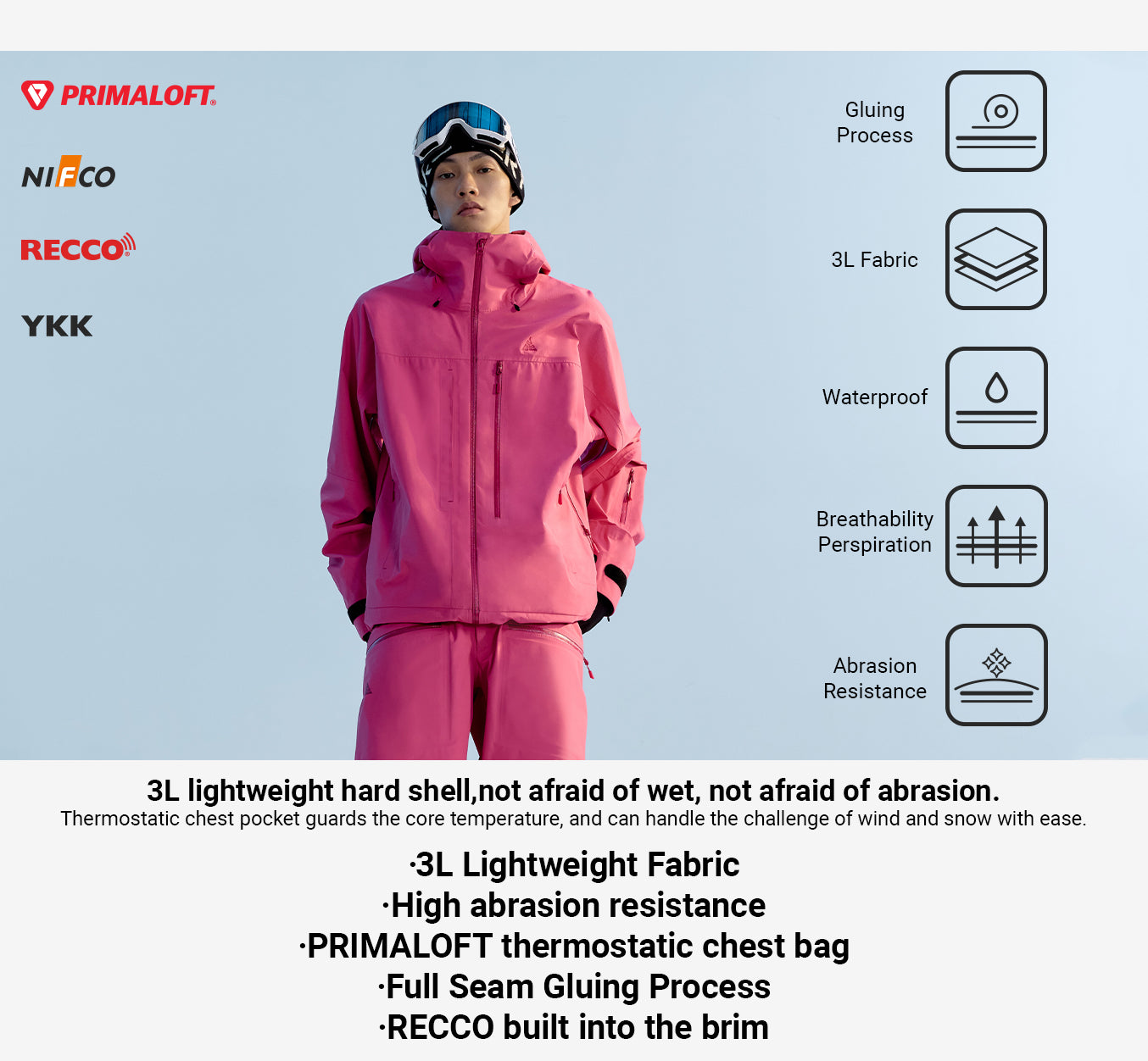 Thermostatic & Lightweight: 3L lightweight hard shell, not afraid of wet, not afraid of abrasion, snow and water do not stain the body, that is, fall that is to go.PRIMALOFT thermostatic chest pocket guards the core temperature, up to -15 °, from the wind and snow to deal with the challenge.