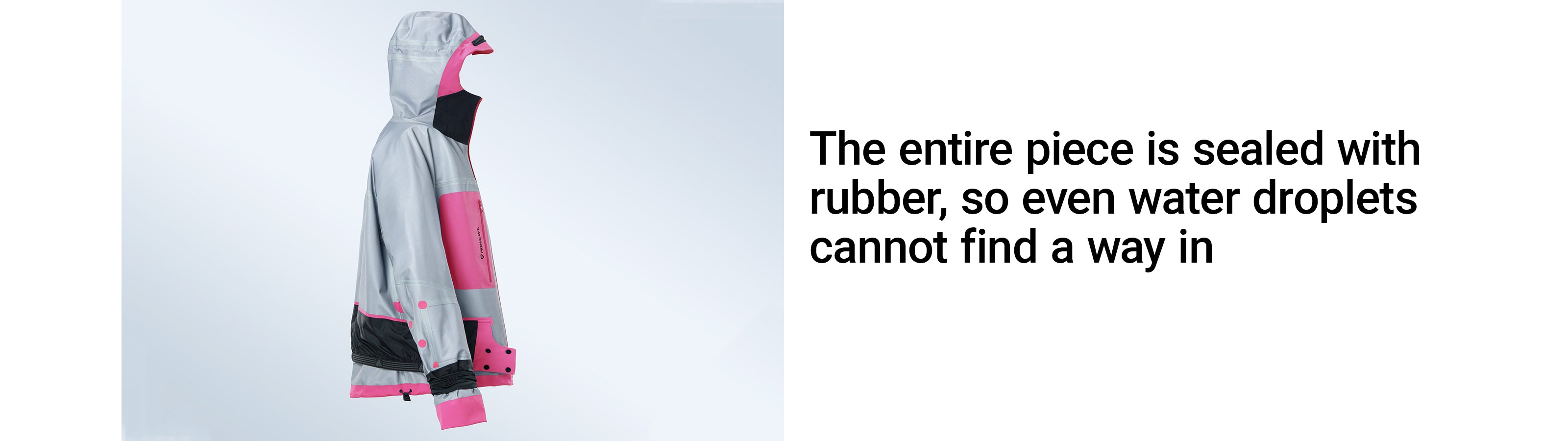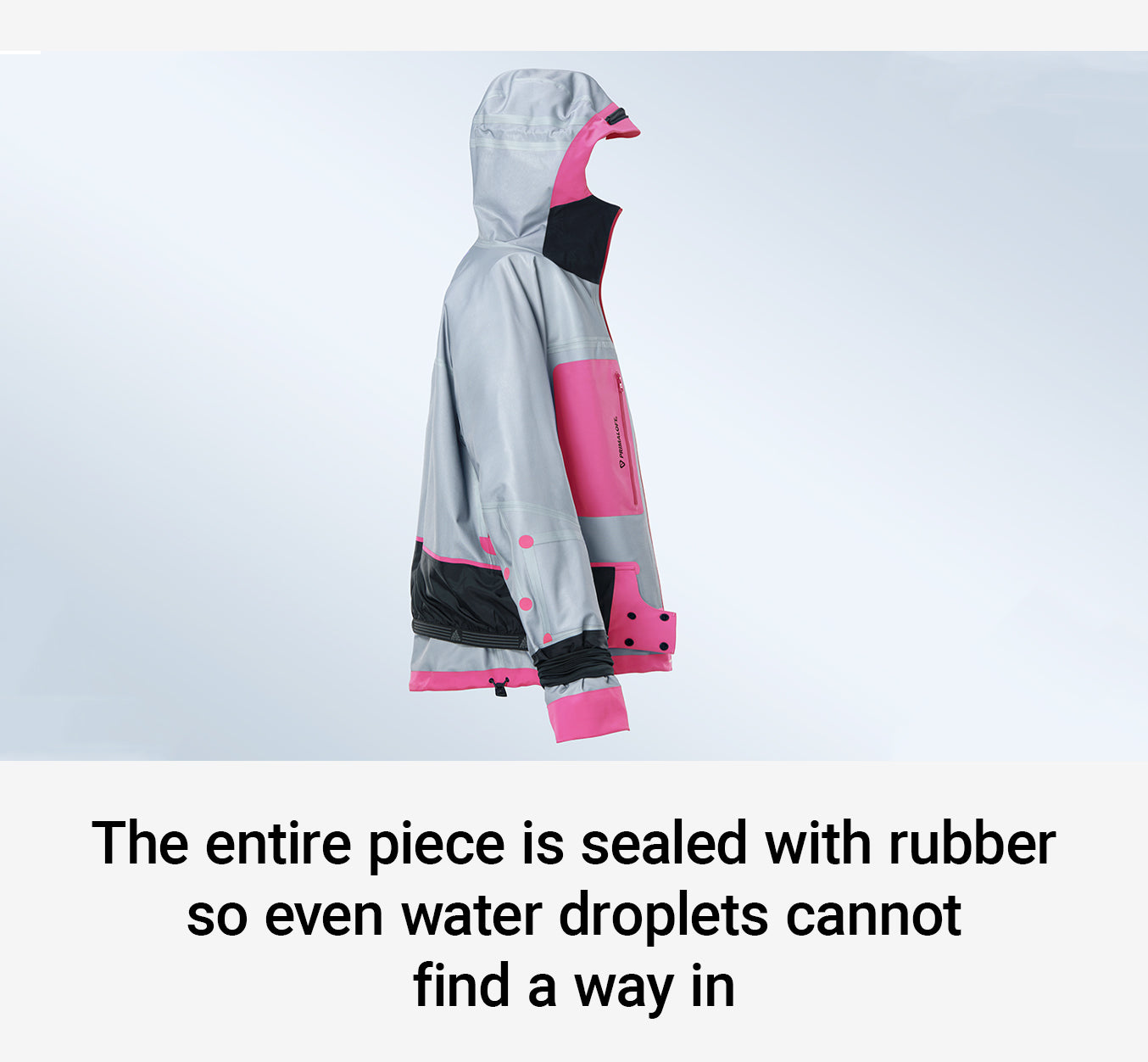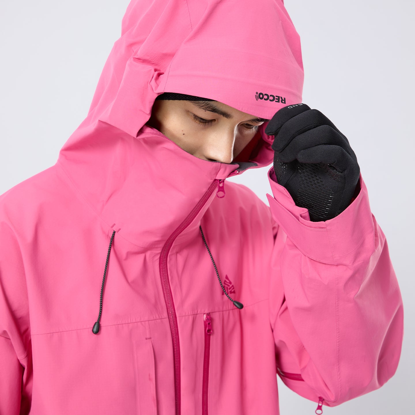 Detail: Underarm YKK zipper wicking system, NIFCO back hood tightening adjustment snaps, front hood one-touch pull-out snaps, hem pull-out adjustment snaps, built-in snow goggle fabric, with arm snow card pockets