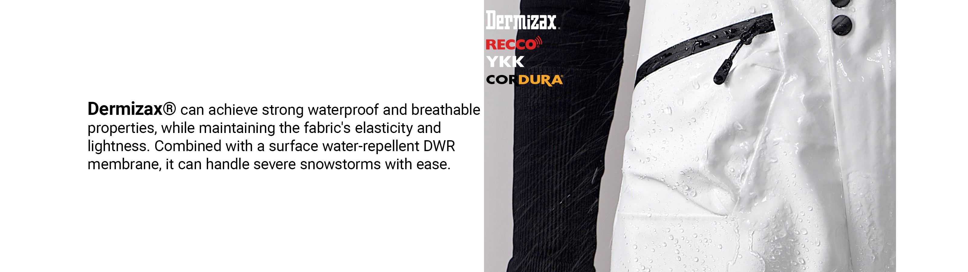 - Fabric: 70D Nylon, 3-Layer Composite Fabric, Dermizax™ Fabric