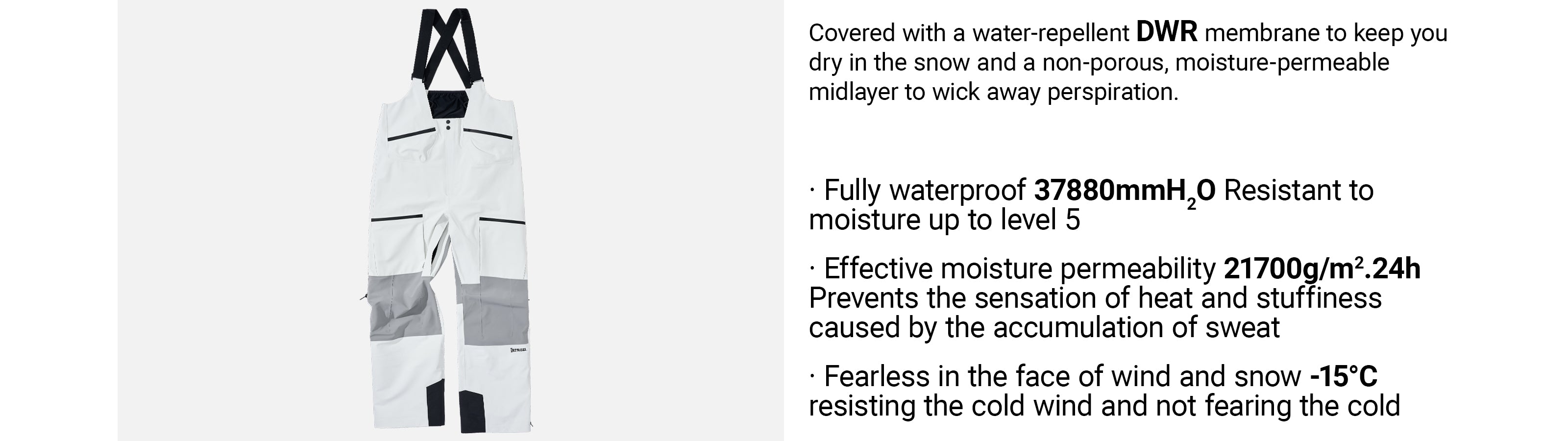 - Membrane: 37880 mm/H₂O Waterproofing, 21700 g/m²/24h Breathability
