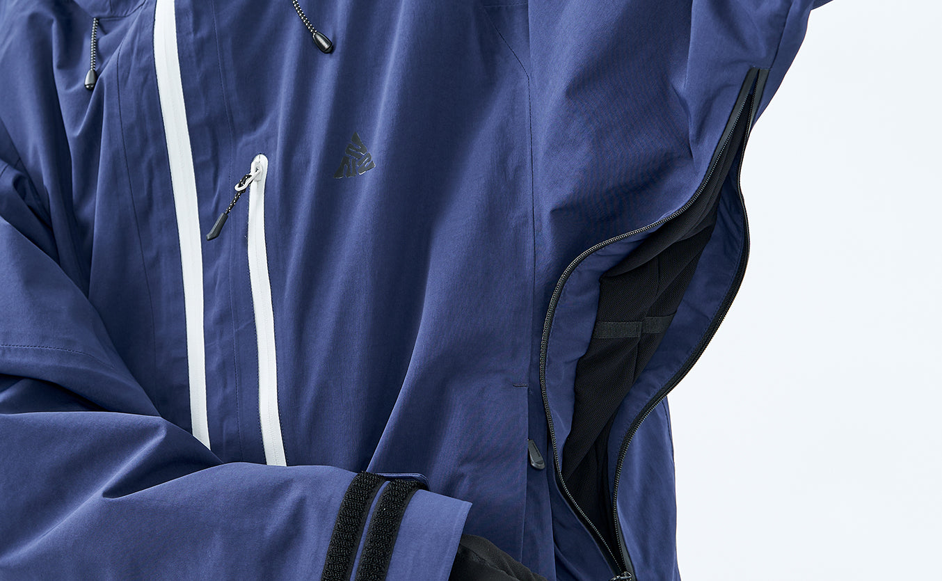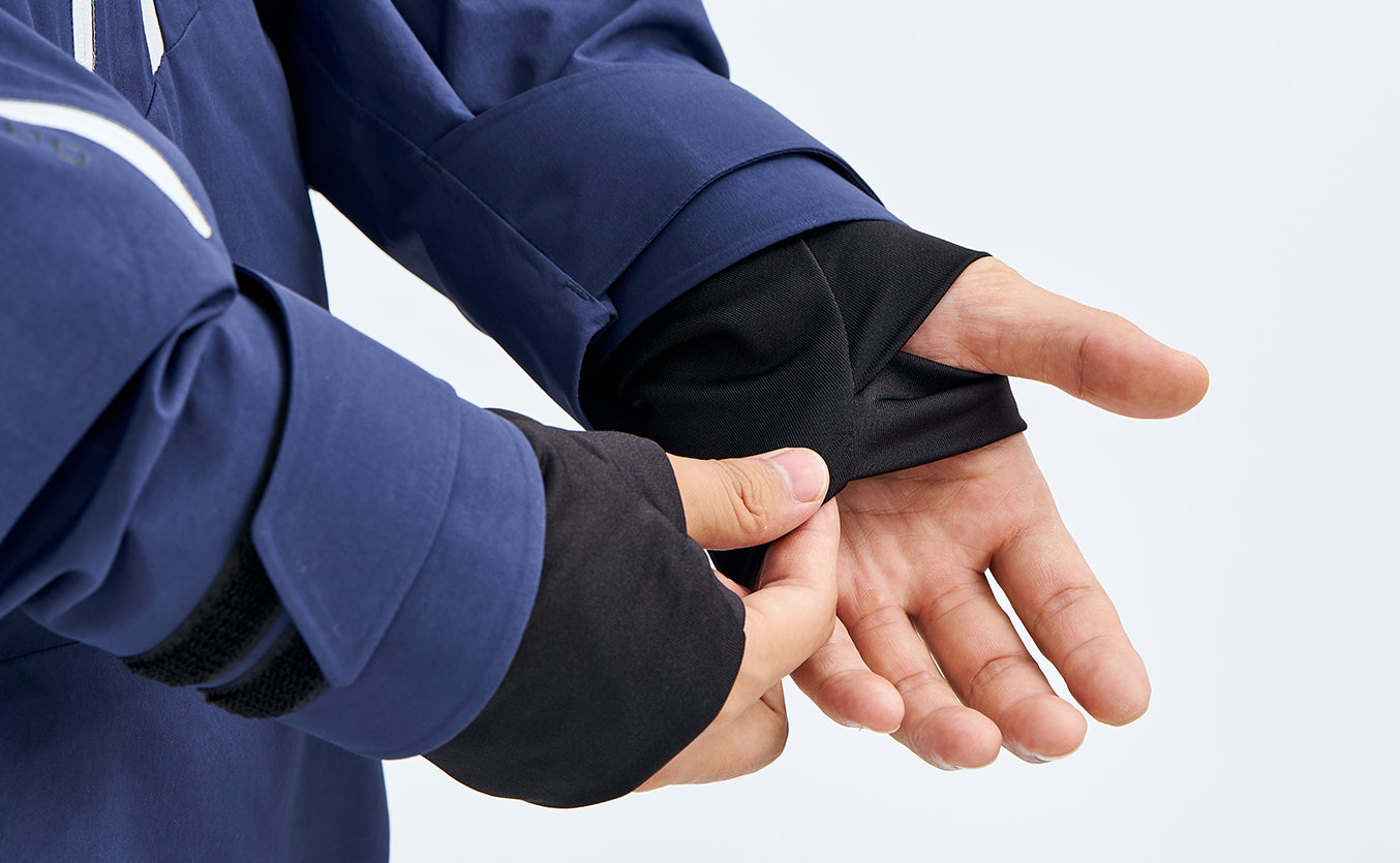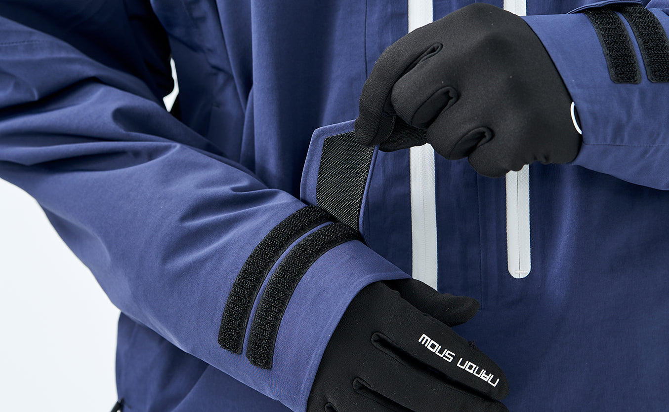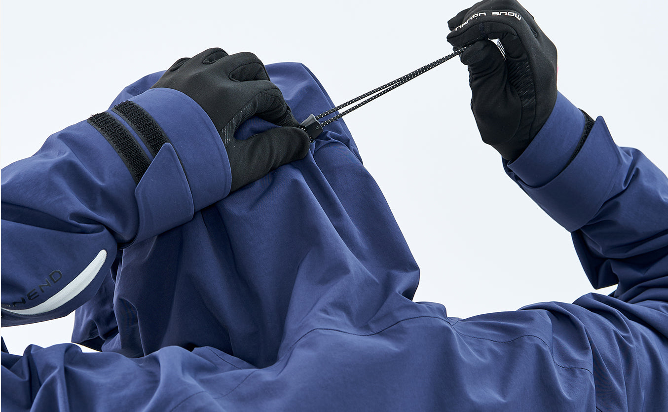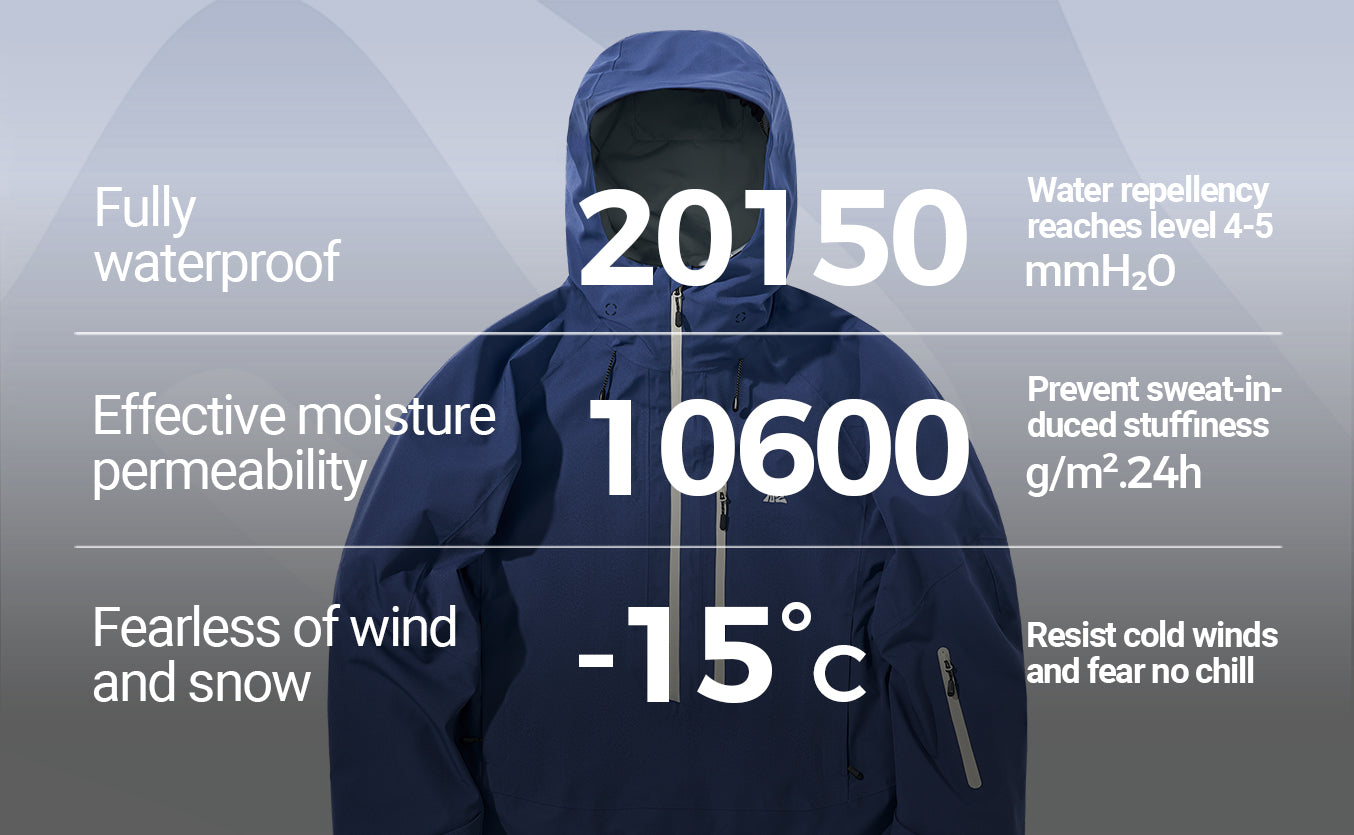 Surface is treated with a durable water-repellent (DWR) coating, enabling it to shed snow and moisture and stay dry even when sitting on snow. Beneath it, a highly breathable membrane in the mid-layer allows perspiration vapor to escape through its micro-pores, preventing internal moisture buildup.